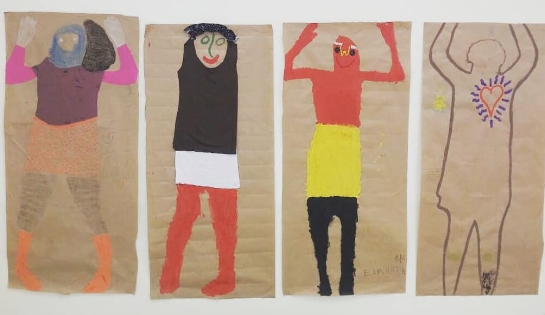 A exemplo: nesta imagem ilustrativa, feita em uma roda de mulheres, pedimos que as participantes, após terem feito um experimento corporal, fizessem um trabalho plástico ilustrando como perceberam seus corpos durante a vivência inicial.